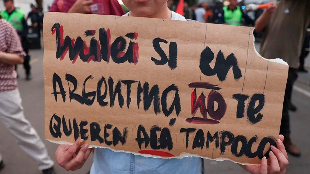 Una persona sostiene un cartel durante una manifestación contra la participación del presidente de Argentina, Javier Milei. EFE/ Juan Pablo Pino