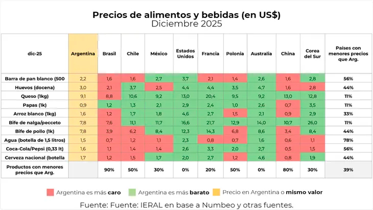 Los datos surgen del análisis del IERAL de la Fundación Mediterránea, en el que calculó los precios de un total de 30 productos consumidos por familias de diferentes países y expresados en dólares. El 90% de los productos argentinos son más costosos que en Brasil en el rubro de alimentos y bebidas, mientras que en lo que respecta a bienes durables —indumentaria y calzado—, el país resulta más caro en casi el 100% de las comparaciones.