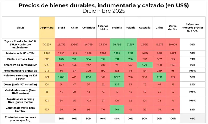 Se analizaron los precios de bienes durables, que incluyen autos, indumentaria, calzado y algunos electrodomésticos. El relevamiento muestra que los precios en Argentina son más caros en un 81% de los casos.
