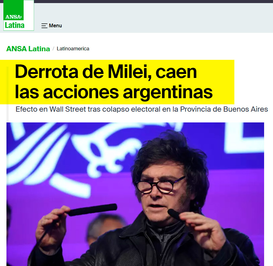 ANSA Latina: Derrota de Milei, caen las acciones argentinas. Efecto en Wall Street tras colapso electoral en la Provincia de Buenos Aires