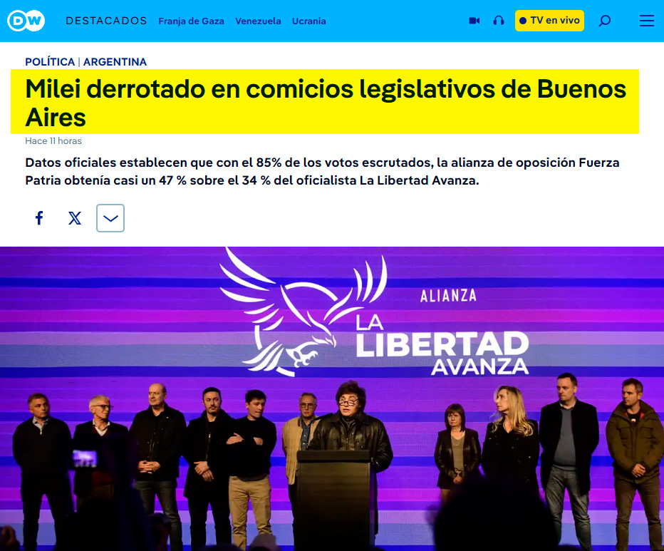 DW: Milei derrotado en comicios legislativos de Buenos Aires. Datos oficiales establecen que con el 85% de los votos escrutados, la alianza de oposición Fuerza Patria obtenía casi un 47 % sobre el 34 % del oficialista La Libertad Avanza.