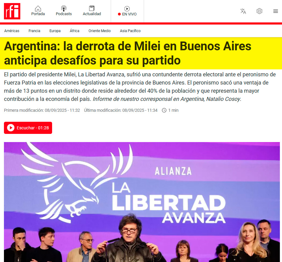 Radio Francia Internacional: Argentina: la derrota de Milei en Buenos Aires anticipa desafíos para su partido. El partido del presidente Milei, La Libertad Avanza, sufrió una contundente derrota electoral ante el peronismo de Fuerza Patria en las elecciones legislativas de la provincia de Buenos Aires. El peronismo sacó una ventaja de más de 13 puntos en un distrito donde reside alrededor del 40% de la población y que representa la mayor contribución a la economía del país.