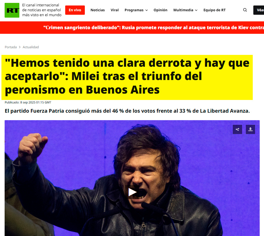 RT: “Hemos tenido una clara derrota y hay que aceptarlo”: Milei tras el triunfo del peronismo en Buenos Aires. El partido Fuerza Patria consiguió más del 46 % de los votos frente al 33 % de La Libertad Avanza.