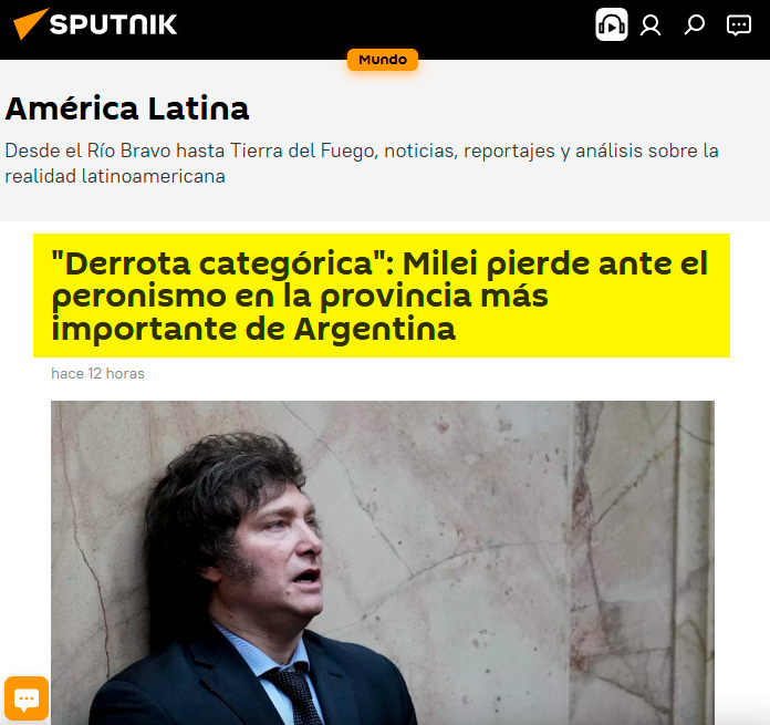 Sputnik: “Derrota categórica”: Milei pierde ante el peronismo en la provincia más importante de Argentina. El Gobierno nacional recibió un fuerte revés en la provincia de Buenos Aires, el distrito más poblado del país y considerado “la madre de todas las batallas”. El peronismo se impuso en los resultados previo a los comicios nacionales.