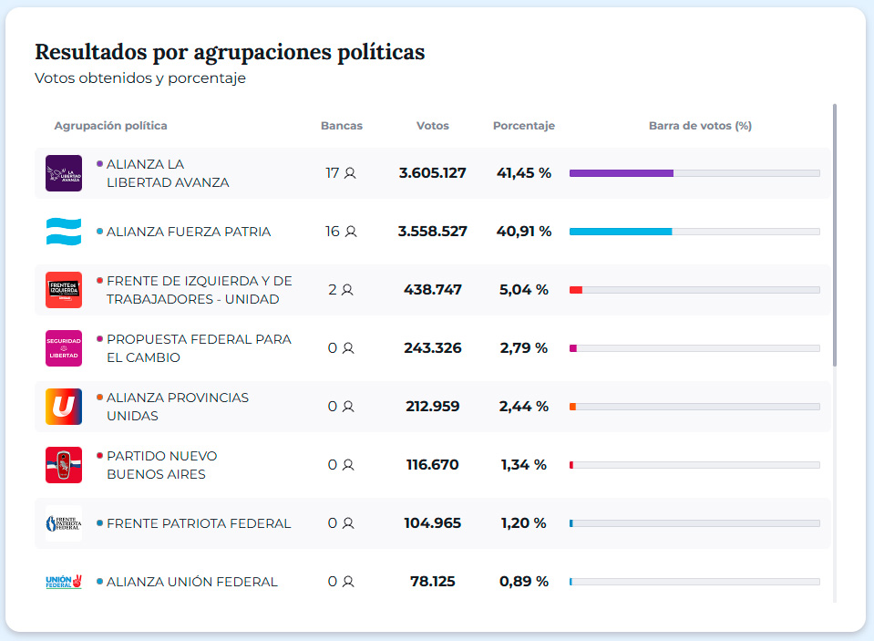 Este domingo 26 de octubre se llevaron adelante las elecciones legislativas argentinas. La Libertad Avanza consiguió una sorprendente victoria a nivel nacional pero en la provincia de Buenos Aires ganó por apenas medio punto porcentual a Fuerza Patria, donde se votaban diputados nacionales.