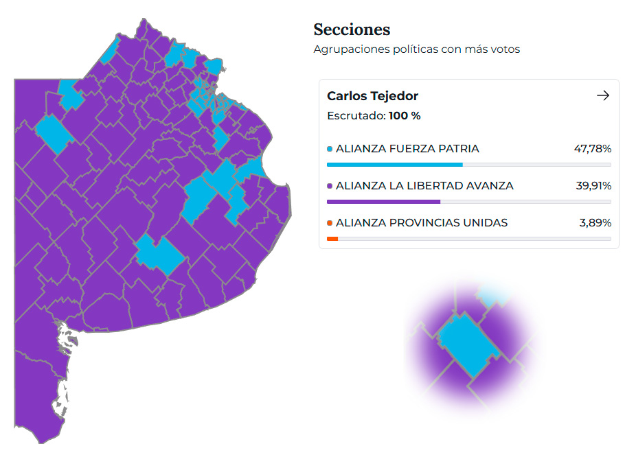 Estos distritos, que corresponden principalmente al conurbano y a determinadas zonas del interior bonaerense, mantuvieron firme su estructura territorial y el voto histórico peronista. Ejemplo de ello es Carlos Tejedor, ubicado en el oeste de la Provincia de Buenos Aires. Allí, Fuerza Patria ganó con el 47.78% de los votos, frente a la segunda posición de La Libertad Avanza, con el 39.91%.
