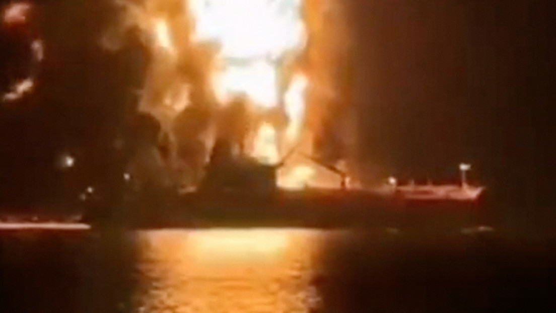 En el video se ve cómo, en plena noche, una embarcación envuelta en llamas es sacudida por una potente y brillante explosión sobre el agua.