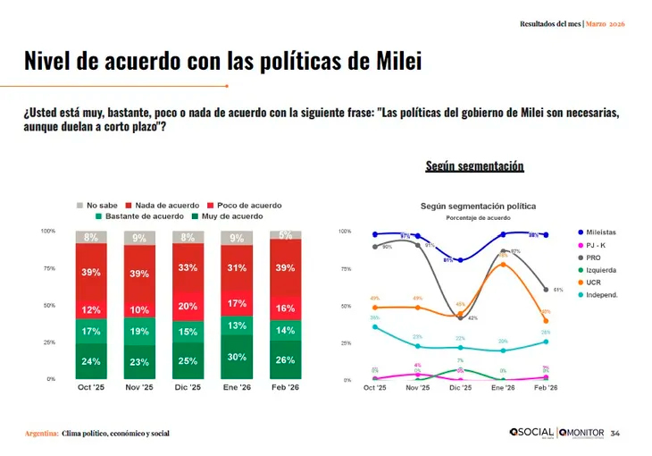 La caída no fue menor, ya que el respaldo retrocedió más de siete puntos respecto del pico alcanzado en septiembre de 2025, cuando el oficialismo todavía capitalizó el impulso inicial de sus reformas.