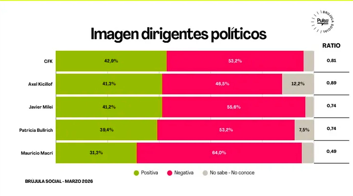 Entre quienes sí mencionaron referentes, Axel Kicillof lideró con 16,4%, seguido por Cristina Fernández de Kirchner con 14,6%. No obstante, quien peor imagen muestra es Mauricio Macri, con un 64% de negatividad.