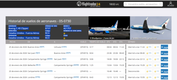 El avión tocó suelo argentino primero en San Juan. El jueves 22 a las 13:04 despegó de Andrews; y las18:06 del viernes 23 aterrizó en San Juan. Hay un registro de 2 horas 12 minutos de permanencia en plataforma. A las 22:12 del mismo viernes, volvió a despegar y a las 23:36 llegó al Aeroparque Jorge Newvery.